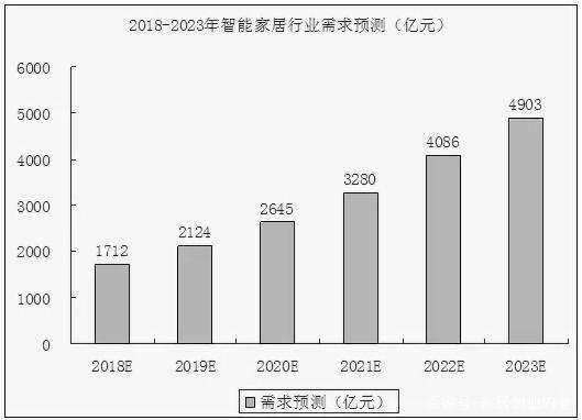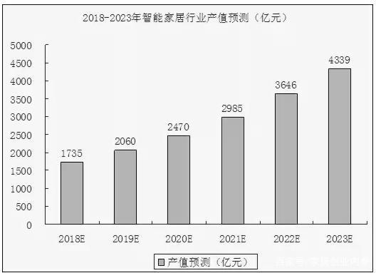 据中研普华预测2020年智能家居行业产值达2470亿元,2023年则会番一番达到4339亿元。同时智能家居行业需求2020年会达2645亿元,2023年4903亿元。行业产值的高速增长和行业需求的扩大,这预示了智能家居行业未来潜力无限。